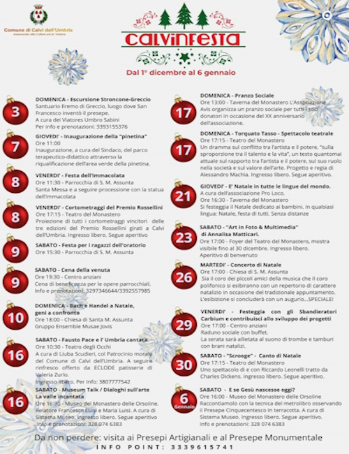 L’imperdibile “Calvinfesta”, a Calvi dell’Umbria dal 1° dicembre ‘23 al 6 gennaio ‘24, con tanti eventi nel centro storico, a teatro, proiezioni, mostre fotografiche, visite al Museo, con opere sorprendenti: Lavinia Fontana, Bruegel il giovane, Van Wittel, Pompeo Batoni, poi incontri sull’arte, gastronomia, visite agli straordinari presepi artigianali, e allo spettacolare presepe monumentale. Inoltre, numerose altre proposte dedicate ai vari interesse di tutti i curiosi.