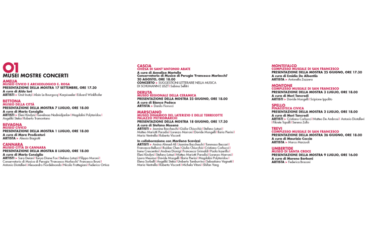 Die Werke, die in enger Zusammenarbeit mit dem Umfeld entstanden, wurden eigens für die Museen von Amelia, Bettona, Bevagna, Cannara, Cascia, Deruta, Marsciano, Montefalco, Montone, Spello, Trevi und Umbertide kreiert und können vom 18.