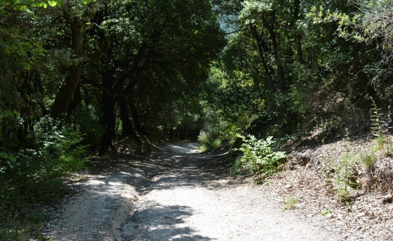 Wir kehren auf die Hauptstraße zurück und kommen an eine Kreuzung, an der der historische Weg beginnt, der Sassovivo mit Pale verbindet, während sich links in einer weiten Kurve die unbefestigte Straße des „Passo delle Capre“ (Ziegenpass) öffnet. Ohne die verschiedenen Umwege zu beachten, gehen wir auf der Schotterstraße weiter und halten uns dabei an die Richtung des Grabens auf der linken Seite, bis wir in einen Steineichenwald kommen, der in einem Pass endet.
