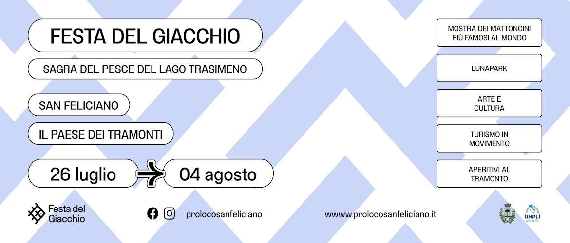 Vom 25. Juli bis 3. August 2025 findet in San Feliciano (Magione), einem malerischen Dorf mit Blick auf den Trasimenischen See, die 43. Ausgabe des Festa del Giacchio statt – ein Fest zu Ehren der lokalen Fischereitradition, Kultur und Küche.