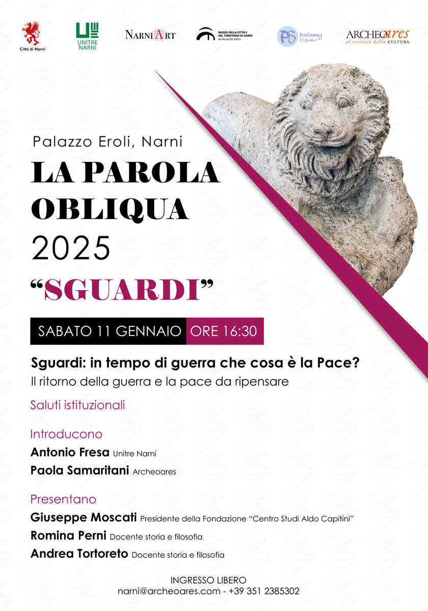 Am Samstag, den 11. Januar 2025, um 16:30 Uhr eröffnet das Palazzo Eroli Museum in Narni die dritte Ausgabe der Veranstaltungsreihe „La Parola Obliqua. Una visione inattesa“ mit dem ersten von fünf Terminen, die dem Thema „Sguardi“ gewidmet sind, verstanden als überraschende Perspektiven auf die Welt.