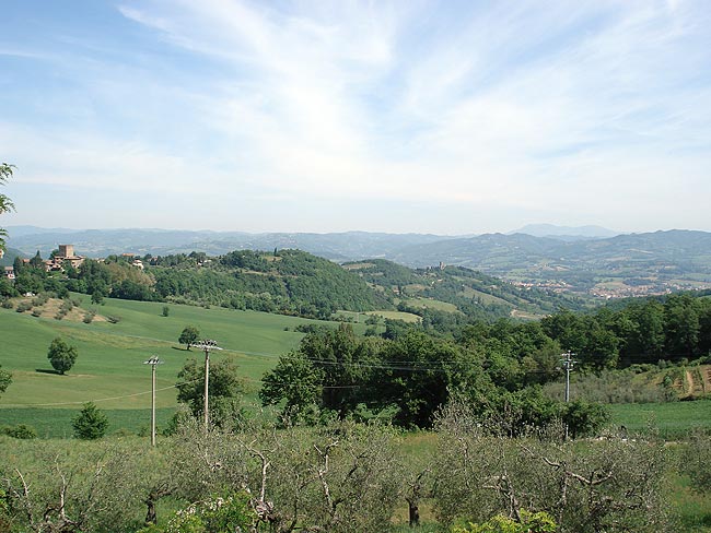 Wir verlassen Umbertide in Richtung Città di Castello, biegen schon nach 600m links Richtung Castel Rigone und Preggio ab und nehmen die ersten Steigungen in Angriff, die uns nach 15km zum 750m hoch gelegenen Colle Campana bringen. Mit Ausnahme des letzten, zum Gipfel führenden Abschnitts ist der Anstieg nicht sehr steil und wird auf halbem Weg sogar von zwei Kilometern Abfahrt unterbrochen. Am Ende des Anstiegs angekommen, können wir einen großartigen Ausblick genießen: Links auf den Monte Tezio und den umbrisch-märkischen Apennin, rechts auf den Trasimenischen See bis zum Monte Amiata. Die Straße geht weiter bergauf und bergab, wobei wir auch zwei recht anspruchsvolle Steigungen bewältigen müssen. Bei Kilometer 18 erreichen wir dann die Ortschaft Castel Rigone, in der wir eine kurze Erfrischungsrast einlegen können, bevor wir die Panorama-Abfahrt in Angriff nehmen, die bis zur Uferstraße des Trasimenischen Sees führt