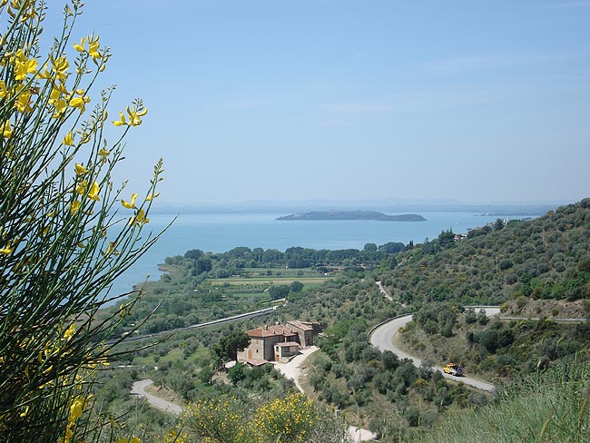 Am Ende der Abfahrt (km 27) wenden wir uns nach rechts in Richtung Passignano, fahren dann auf der Bundesstraße SS75/bis weiter nach Tuoro, wo wir rechts abbiegen und den Hinweisschildern nach Umbertide und Lisciano Niccone folgen. Von hier beginnen wir den 6km langen Anstieg, der zum Gosparini-Pass führt. Im Anschluss an die obligatorische Pause auf der Passhöhe, um den phantastischen Blick auf den Trasimenischen See zu genießen, fahren wir bergab in Richtung Lisciano Niccone und biegen am Ende der Abfahrt (km 49) links in Richtung Umbertide ab. Wir radeln jetzt im Tal des Niccone, das sich durch die geometrisch angeordneten und ganz unterschiedlich bestellten Felder auszeichnet.