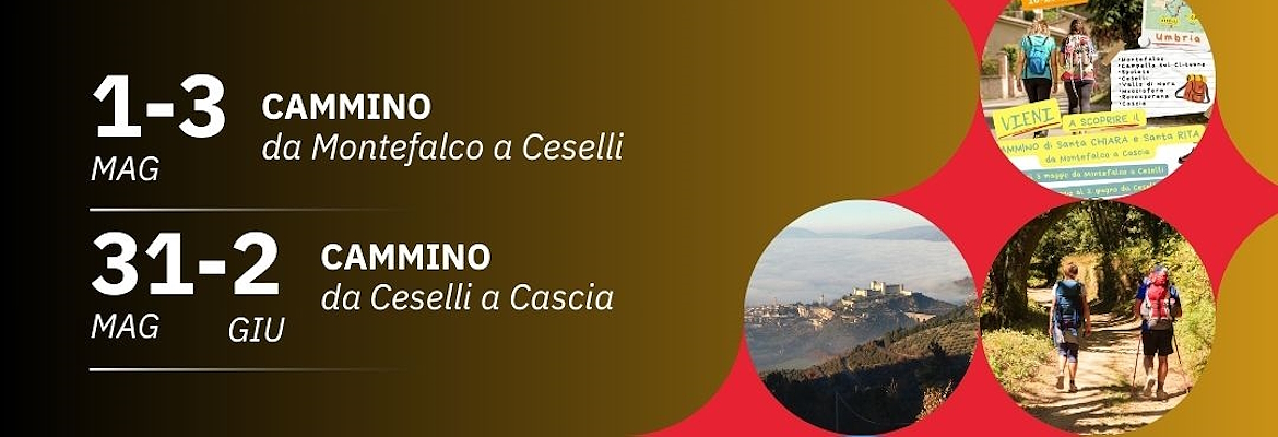 Es wird zwei Termine geben, um den „Weg der Heiligen Klara und Rita von Montefalco nach Cascia“ zu entdecken: der erste findet vom 1. bis 3. Mai (von Montefalco nach Ceselli) statt, der zweite vom 31. Mai bis 2. Juni (von Ceselli nach Cascia).