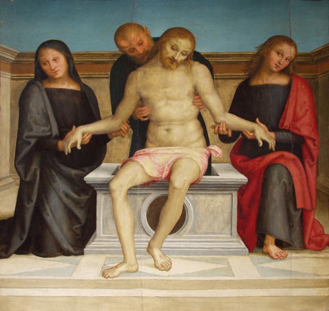 Along the walls of the left nave are notable works such as Pietà, part of the broken altarpiece for Sant'Agostino from the church of Sant'Agostino by Pietro Perugino. In the Vibi chapel notable works include the marble Dossale of the Young Jesus, the Baptist, and Saint Girolamo attributed to Mino da Fiesole (dating from 1453), Annunciation by Giovan Battista Caporali and Visitation by Stefano Ciburri (dating from 1530). Next is the Ranieri chapel with a ceiling decorated with paintings by Annibale Brugnoli (XIX) over a work by Caporali. The Sacramento chapel has instead a ceiling decorated by Francesco Appiani and Pietro Carattoli. On the altar is a picture of the Madonna of Giglio from the 14th century in the centre of a painting depicting Saints Peter and Paul by Jean Baptiste Wicar (19th century).