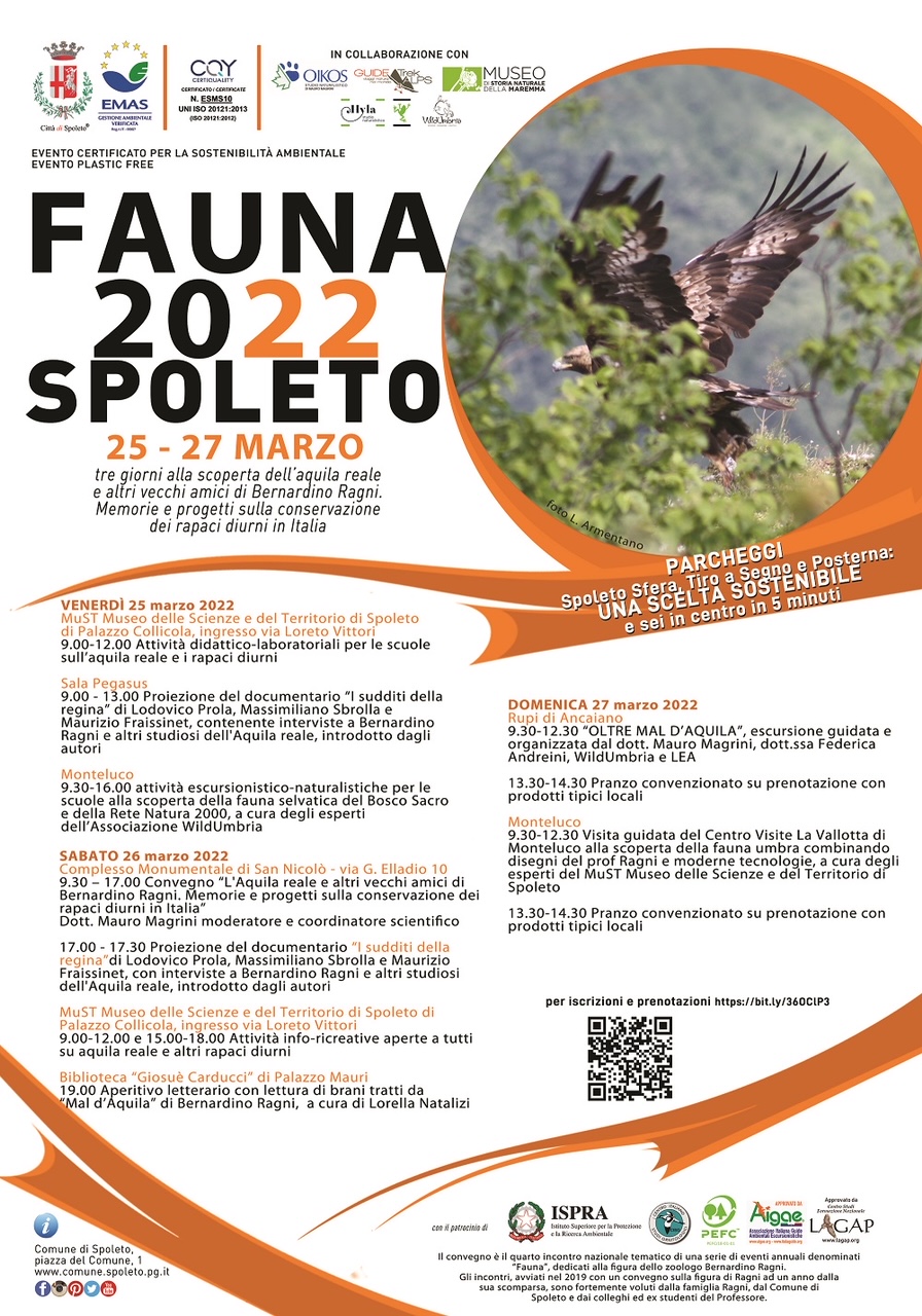 La rassegna, avviata nel 2019 con un convegno sulla figura di Ragni e proseguita nel 2020 e nel 2021 con incontri e iniziative collaterali dedicati al “Gatto Selvatico Europeo” e al tema “Il lupo in Italia: conoscenze attuali e prospettive future”, è fortemente voluto dalla famiglia Ragni, dal Comune di Spoleto e dai colleghi ed ex studenti del Professore. Nel corso dell'iniziativa si potrà approfondire la conoscenza della fauna selvatica italiana e scoprire le peculiarità della Collezione Bernardino Ragni con particolare attenzione, quest'anno, all’Aquila reale