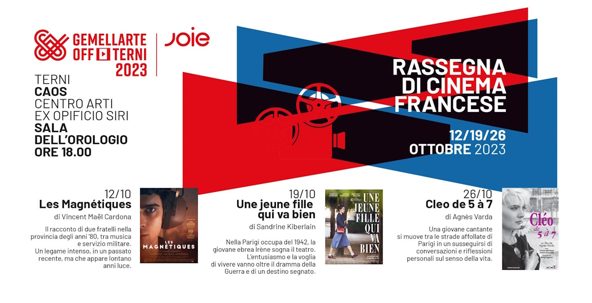 Oltre al Festival artistico e alla doppia residenza, GemellArte 2023 sarà accompagnato ancora una volta da 📽️GemellArte Off, rassegna gratuita di film di produzione francese, proiettati in lingua originale con sottotitoli in italiano, organizzata insieme all’Institut Français Italia. Il progetto è curato dalla giornalista Sara Michelucci e da Fabrizio Borelli, regista, fotografo e autore, che apriranno e chiuderanno le proiezioni. La rassegna si terrà nei giovedì 12, 19 e 26 ottobre all’interno del Museo Caos di Terni.