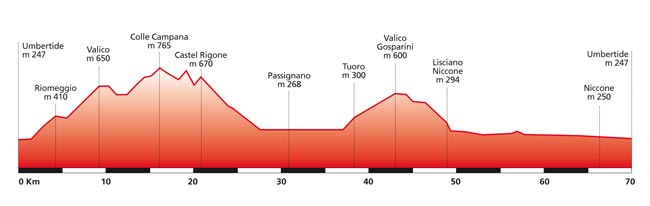 After a total of 51 kilometres you come to Mengaccini, where you can fill your water bottle at a fountain on the right, but should you miss this you can do likewise at the village of Niccone at km. 66.5. When you reach the junction with the SS3bis at Niccone, turn right and ride back to the starting point in Umbertide, another 4 kilometres further on. However, should you feel like extending your ride, you can turn left at the same junction, in the direction of Città di Castello. About one kilometre past the village of Montecastelli, turn right off the SS3bis onto the local road that climbs up for about 4 km. to the beautiful medieval town of Montone. After a brief visit to this unique little town, classified among the most beautiful small towns in Italy, follow the signs to Umbertide, which is another 10 km. further on, most of which being downhill.