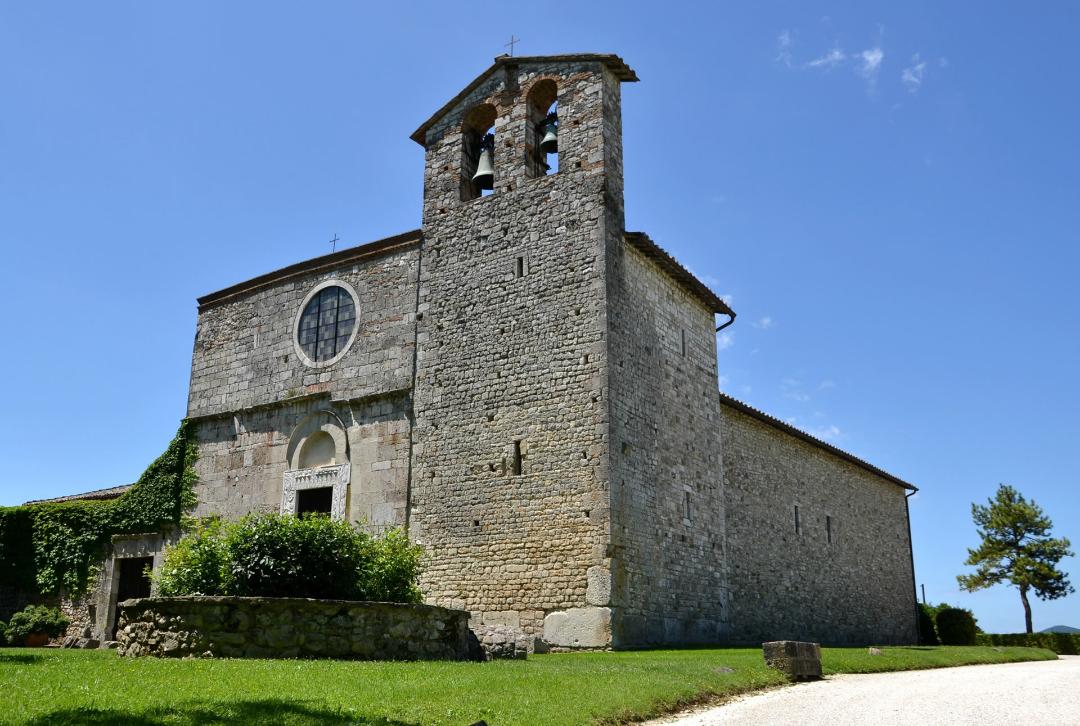 On the simple facade, which dates back to the 12th century, there is a portal architrave with a lunette and rose window above it; on the right side is the bell tower which, towards the rear of the building, becomes a belfry with a double archway.