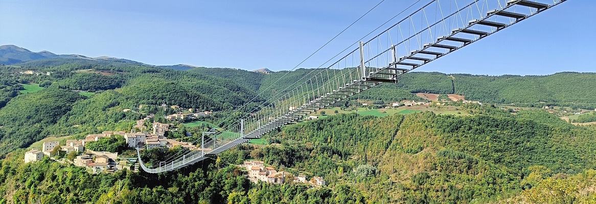 An engineering work that joins Sellano to the hamlet of Montesanto, it holds the record of being the highest suspension bridge in Europe with a height of 175 m and a length of 517.5 m, 1,023 steps and is uphill, with no less than 68 metres of positive height difference between the two stations.