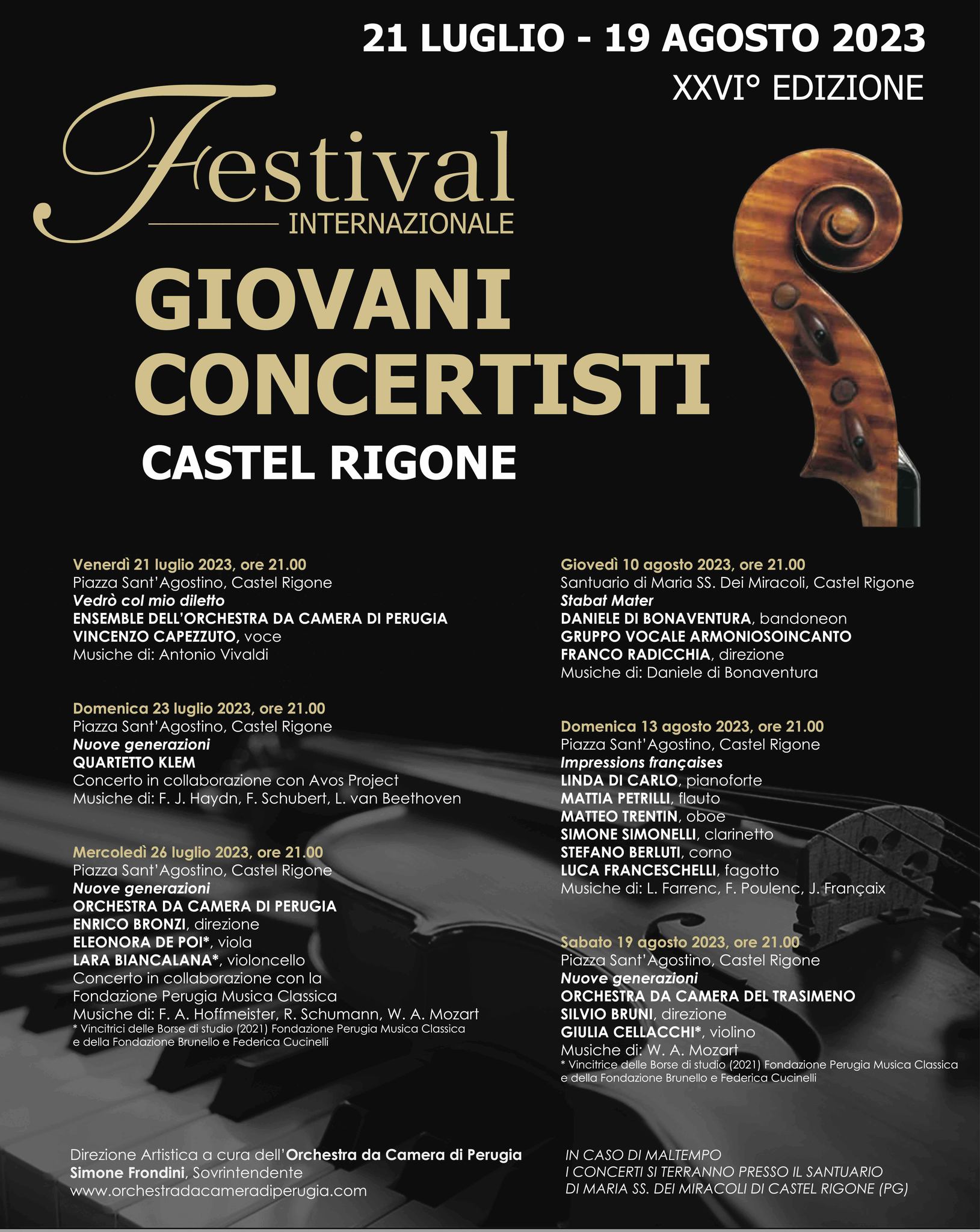 The International Young Concert Artists Festival, now in its XXVIth edition, will be held from July 21 to August 19 in Piazza S. Agostino, Castel Rigone (Passignano sul Trasimeno), under the artistic direction of the Perugia Chamber Orchestra, one of Umbria's most important musical entities.