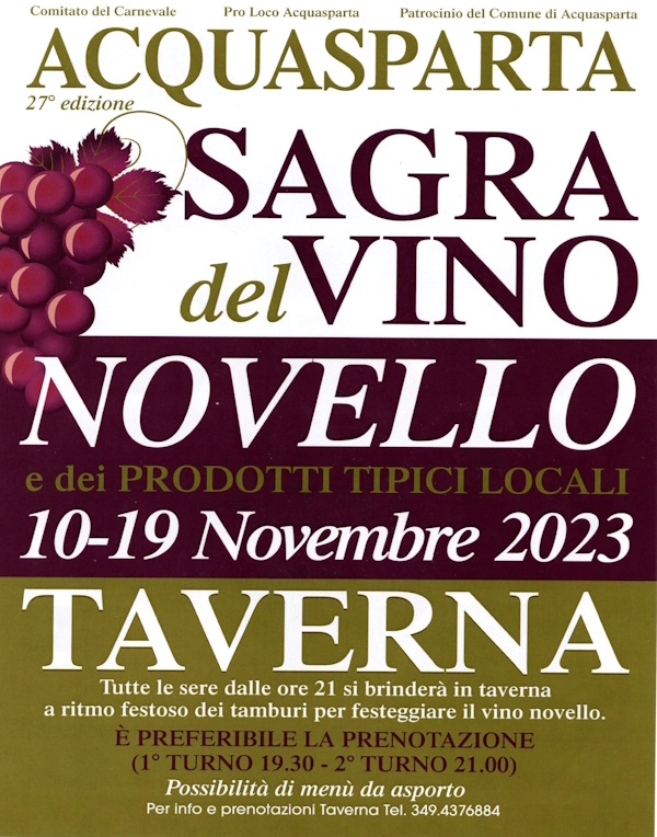 La 27° edizione della "Sagra del vino novello e dei prodotti tipici locali" si terrà dal 10 al 19 novembre 2023, ad Acquasparta.