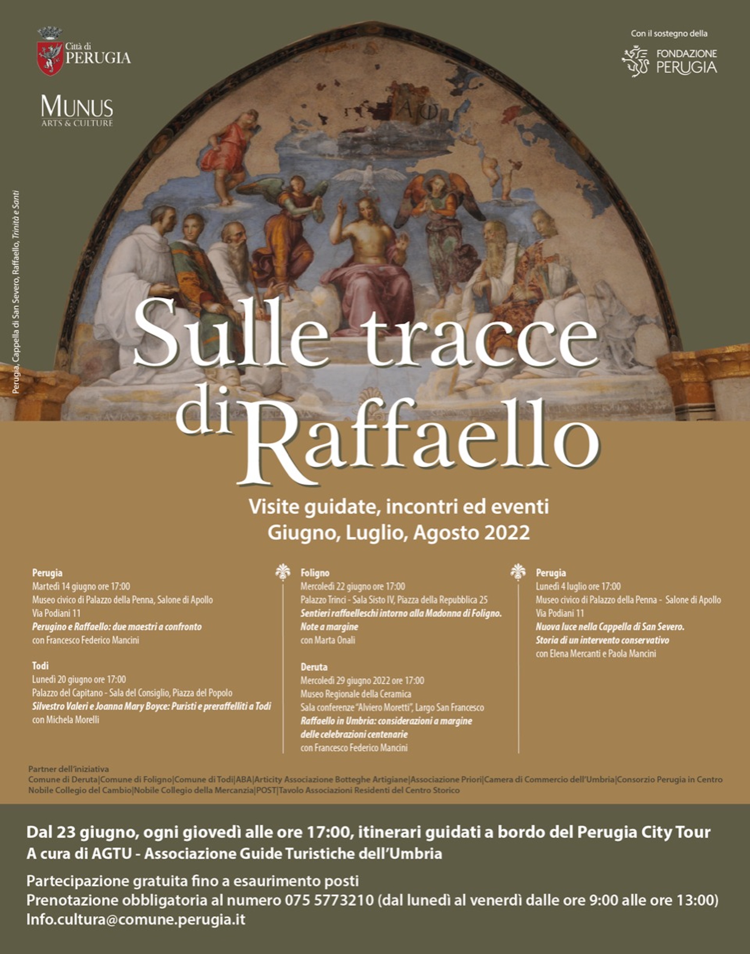 Una serie di appuntamenti estivi, con visite guidate, incontri ed eventi, a partire da giugno fino a fine agosto, con tante iniziative ‘’fuori porta’’ in collaborazione con il Comune di Deruta, il Comune di Foligno e il Comune di Todi, partner del progetto insieme ad altre istituzioni.