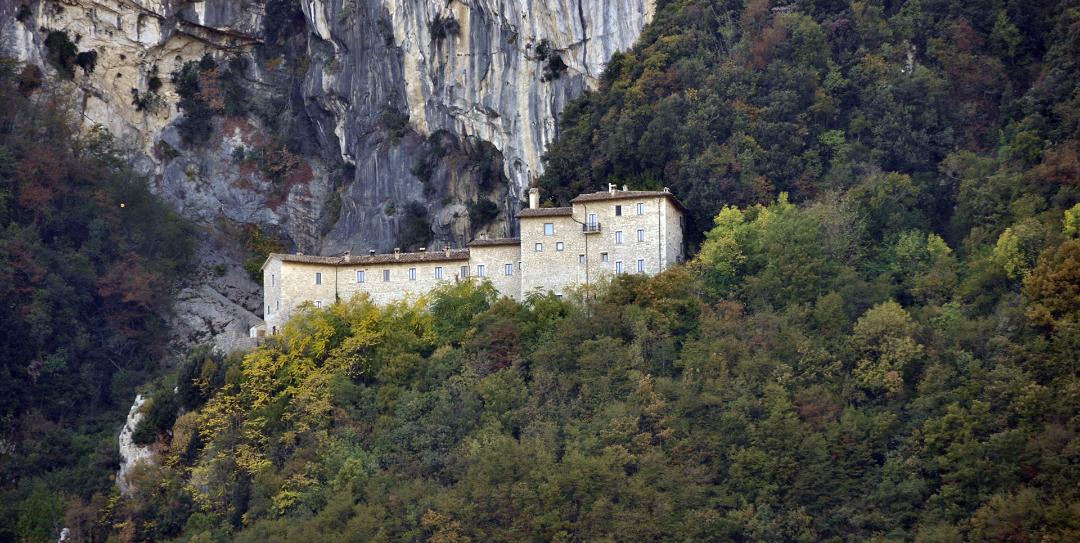 Si la présence en ces lieux de Saint Jérȏme, docteur de l'Église, doit être considérée comme une pure légende, c'est au contraire une hypothèse plausible de penser que Saint Dominique Loricato (+1060) fut l'un de ses premiers habitants. À la fin du XIIIe siècle, il a été choisi comme lieu de retraite par Tommaso de Costacciaro le Bienheureux, qui a vécu dans la solitude pendant 65 ans.