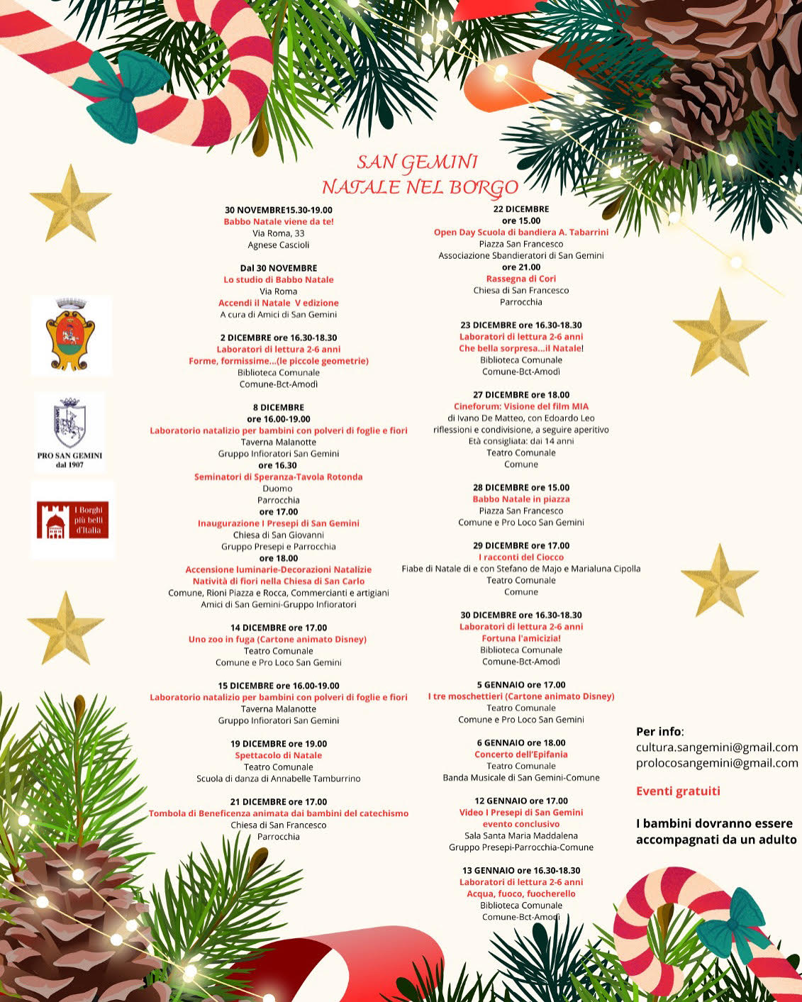 À la bibliothèque municipale, tous les lundis et vendredis, des ateliers créatifs seront organisés pour les enfants de 2 à 10 ans ; au théâtre municipal, des dessins animés de Disney seront projetés ; le Père Noël sera présent dans la Via Roma et sur la Piazza San Francesco l'après-midi du 28 décembre pour un événement de théâtre et d'animation ; pour les adultes, une table ronde sur l'espoir et deux concerts avec cinq chorales le 22 décembre et le groupe musical San Gemini le jour de l'Épiphanie sont prévus.