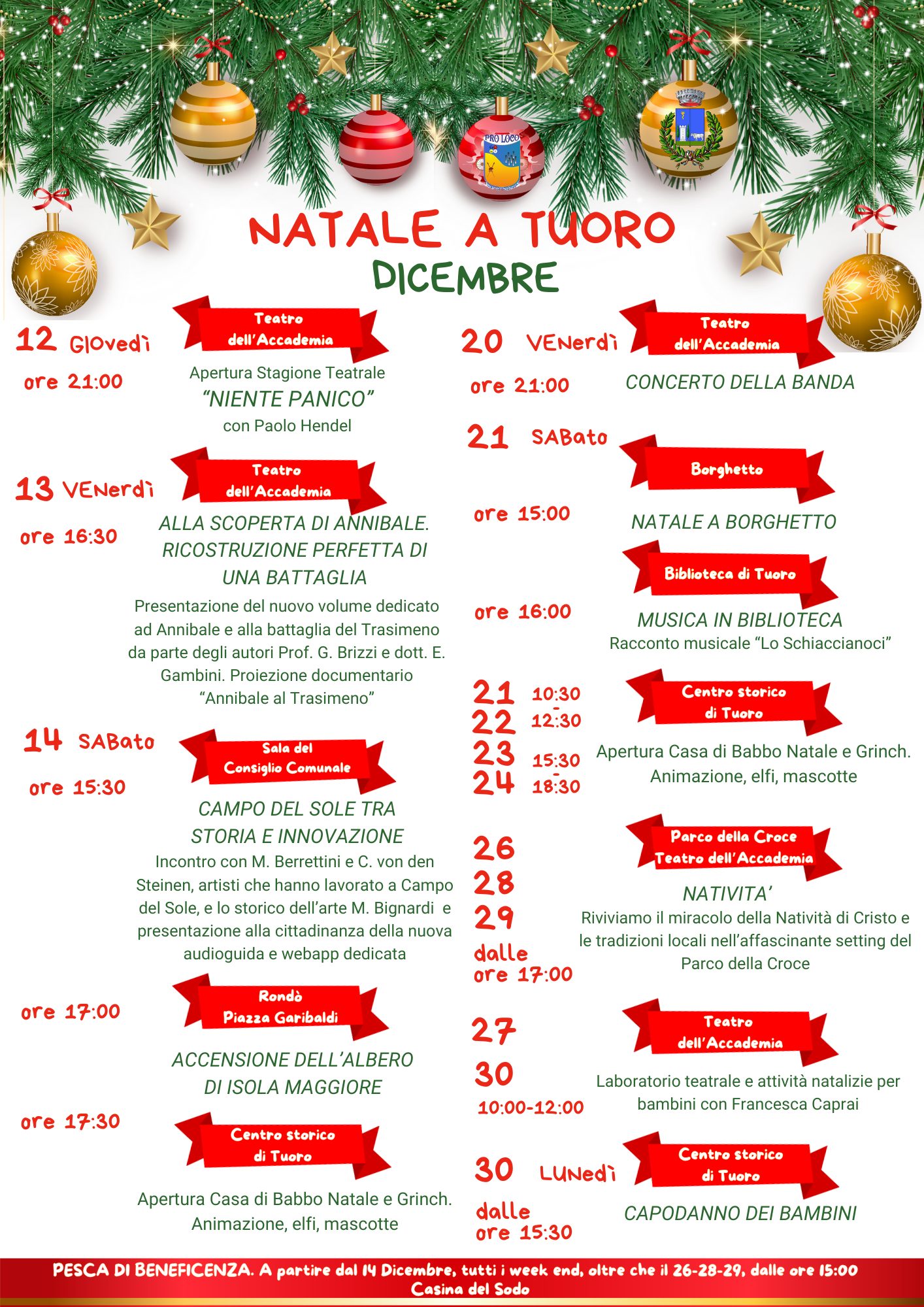 Le programme comprend, entre autres initiatives, le samedi 14 décembre, à 17 heures, l'illumination de l'arbre de Noël sur l'Isola Maggiore, à 17 h 30 l'ouverture de la Maison du Père Noël et du Grinch dans le centre historique, et les 26, 28 et 29 décembre 2024 et les 1er et 6 janvier 2025, à 17 heures, 18 heures et 19 heures, la mise en scène du spectacle de la Nativité, pour revivre le miracle de la Nativité du Christ et les traditions locales au Parco della Croce.