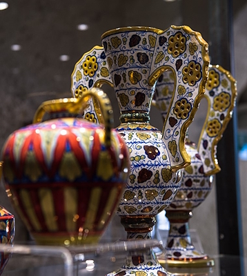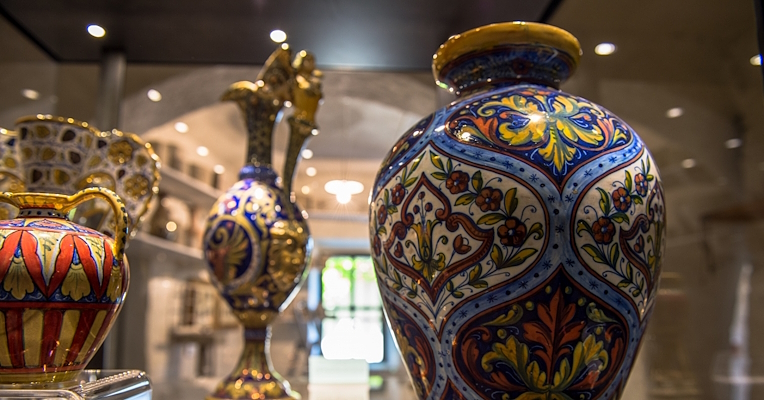 The turning point was in the second half of the 19th century, with the revival of the art of metallic gold and ruby lustre in the work of Paolo Rubboli (1838-1890): production of artistic majolica of the highest quality that had a positive impact on the future of the city. Even today, the traditional types of decoration used in the Gualdo Tadino factories consist primarily of decoration with grotesques, foliage, flakes, "quartieri" and other motifs, normally on a blue background, combined with classical scenes and subjects, glazed with gold and ruby in traditional kilns known as "muffole", as mentioned in the "Tre libri del vasaio" by Cipriano Piccolpasso.