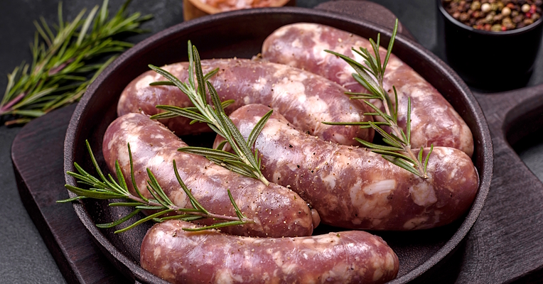 Raw pork sausages grill with spices and herbs on a dark concrete table. Cooking at home