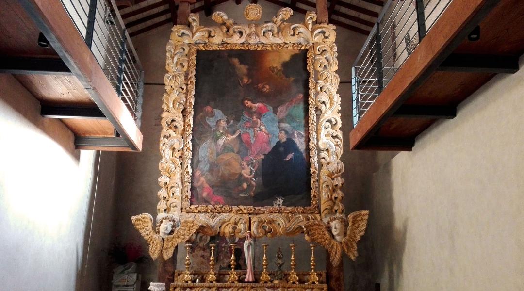 Sopra l’altare è posta una tela di scuola romana del secolo XVII, racchiusa da una ricca cornice intagliata e policroma di artigianato locale.