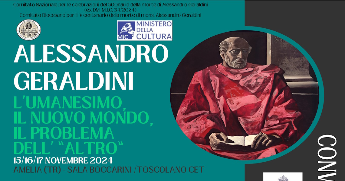 Venerdì 15, sabato 16 e domenica 17 novembre 2024 si terrà il Convegno Internazionale 500° anniversario - Alessandro Geraldini sul tema “L’Umanesimo, il nuovo mondo, il problema dell’altro”, presso la Sala Boccarini di Amelia e il CET Toscolano di Avigliano Umbro.