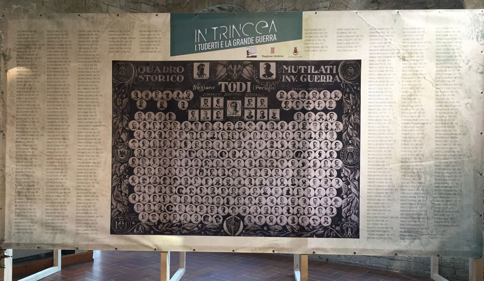 "In Trincea. I tuderti e la grande guerra: testimonianze, immagini, documenti, ricordi" è il titolo della mostra allestita nella duecentesca Sala delle Pietre dei Palazzi comunali di Todi, in occasione del Centenario della Prima Guerra Mondiale.