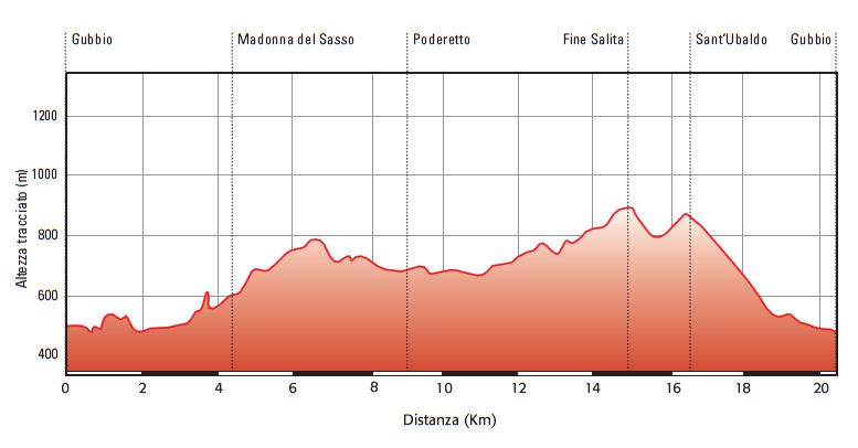 La prima salita inizia dopo pochi chilometri: si tratta di una suggestiva ascesa che si inerpica per una stretta valle, raggiungendo la piccola chiesa della Madonna del Sasso; dopo la chiesa l'ascesa diventa più ripida e ti conduce alla parte centrale dell'itinerario, caratterizzata da un lungo tratto sterrato che scorre a mezza costa e ti offrirà una vista mozzafiato sul Monte Cucco e su tutto l'Appennino Umbro Marchigiano.