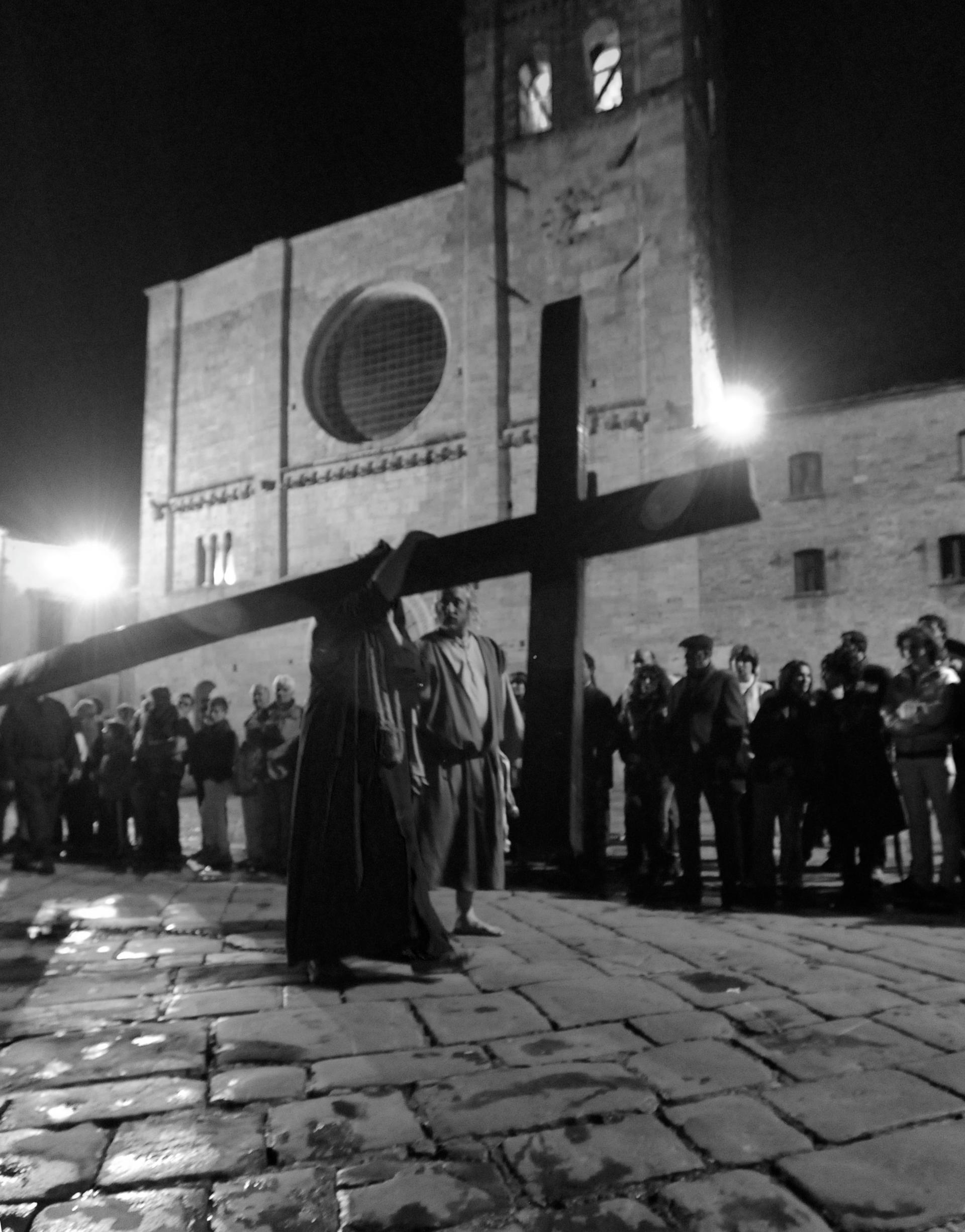 I componenti della Confraternita della Misericordia, in tunica nera e cordone viola, sfilano alla luce delle fiaccole per le vie del borgo, in una rappresentazione di straordinario impatto emotivo che ogni anno crea un’atmosfera mistica.