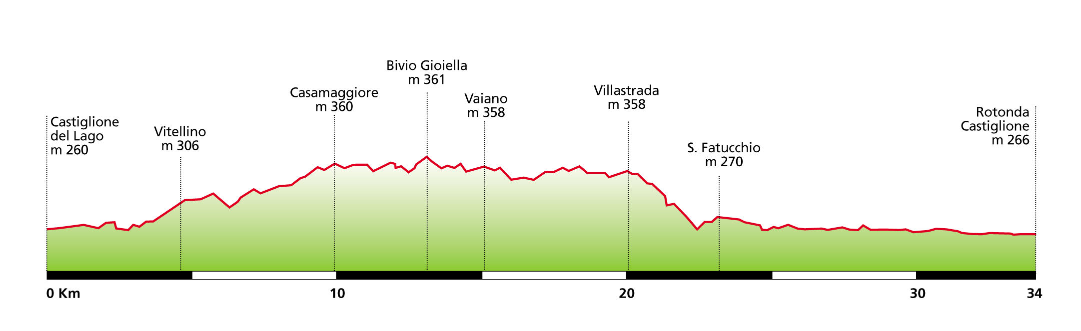 Il percorso parte da Castiglione del Lago, misura 34 chilometri con 350 metri di dislivello.