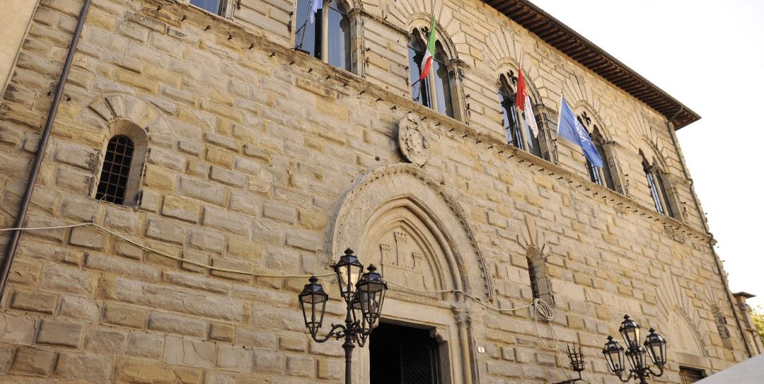 Osservando la decorazione esterna si possono notare in vari punti i motivi tipici dello stemma di Città di Castello che sono la croce e la rocca con tre torri. Sulla lunetta della porta minore è scolpita la figura della Giustizia. La facciata presenta una superficie a bugnato, rustico costituita da conci di arenaria, pietra duttile e tenera presente nelle colline altotiberine, che facilmente si presta alla realizzazione non solo del bugnato, ma anche delle porte e delle bifore. Imponente e severo è l'atrio dove due possenti pilastri ottagonali sostengono l'ampia copertura. Dai capitelli partono delle nervature rettangolari e dei costoloni rotondi incrociati. Salita l'ampia scalinata cinquecentesca, sulla destra, si apre lo spazioso salone del Consiglio dove, dopo i lavori di restauro, sono venuti alla luce dei frammenti di affreschi. Vi sono conservate numerose iscrizioni romane su marmo e pietra nonché i bolli su laterizi provenienti dal territorio; imponente una bella statua raffigurante l'Umbria dello scultore locale Elmo Palazzi. Nella attigua "Sala della Giunta", oltre a cimeli garibaldini, troviamo un grande tela del pittore tifernate Vincenzo Barboni "Martirio di San Lorenzo" dipinta nel 1832.