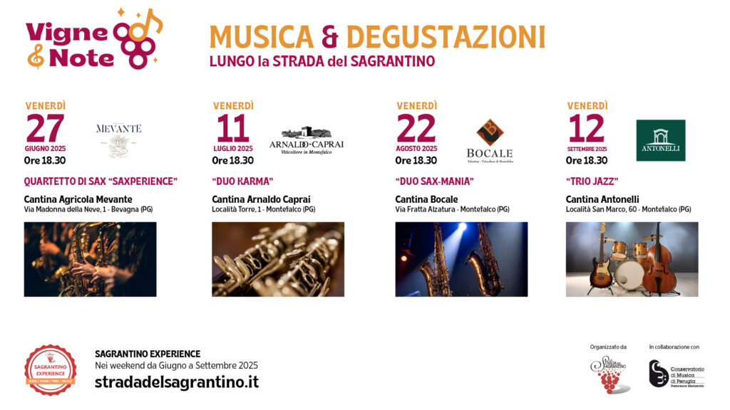 L’iniziativa, giunta alla sua quarta edizione, è promossa da La Strada del Sagrantino in collaborazione con il Conservatorio di Musica Francesco Morlacchi di Perugia. Ogni appuntamento si svolge dalle 18:30 alle 20:00 e propone un percorso che unisce visita guidata in cantina, degustazione di vini locali abbinati a prodotti tipici del territorio, e un concerto tra le vigne a cura degli allievi del Conservatorio.