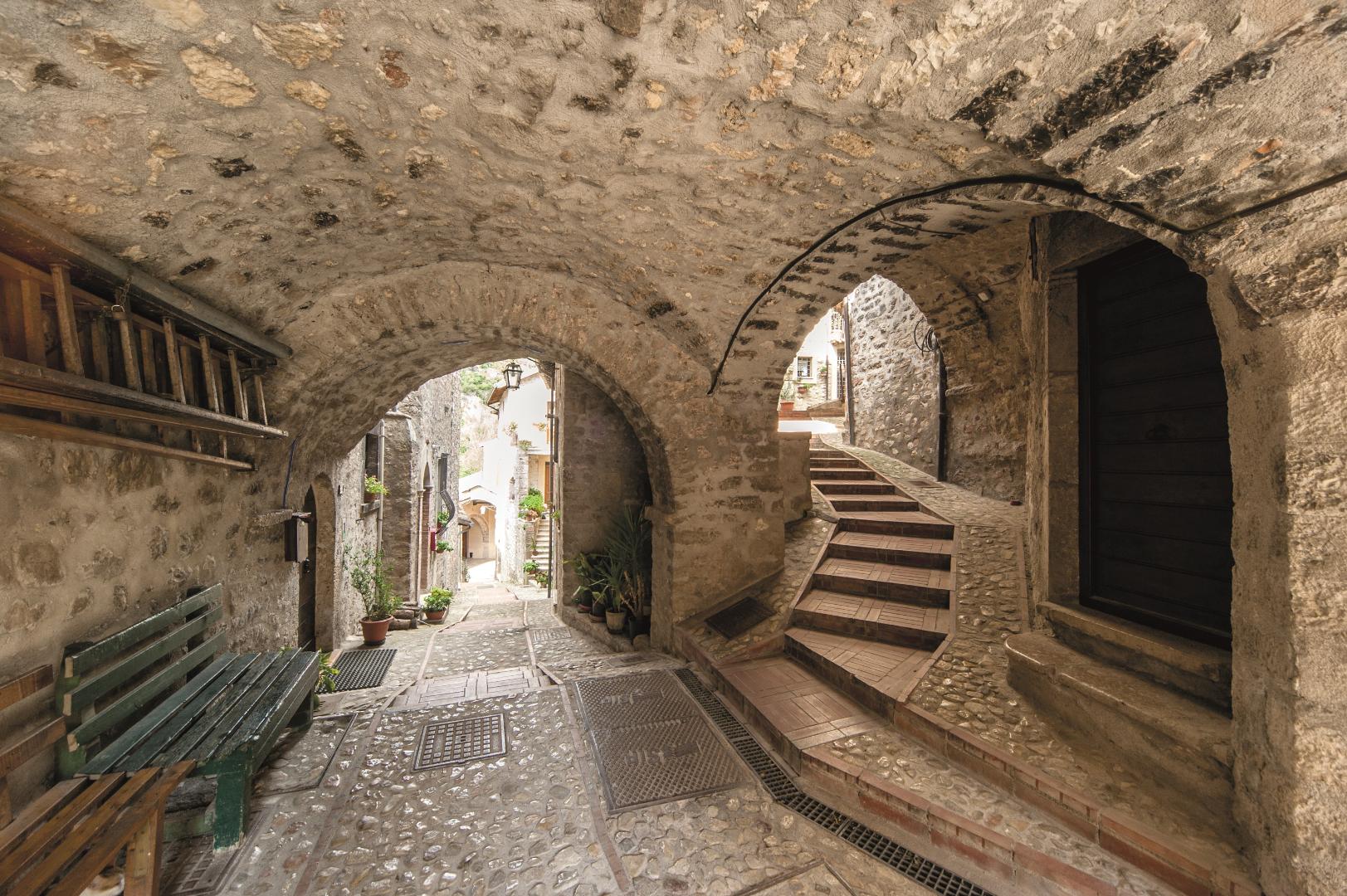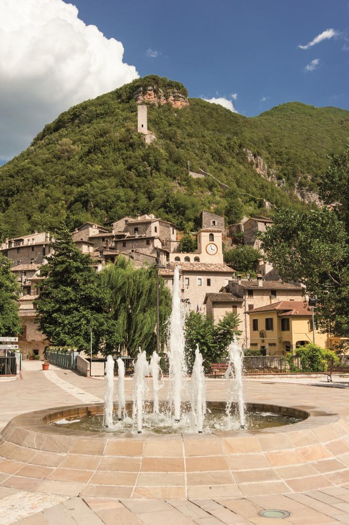 Scheggino è un castello di pendio a forma triangolare, coronato al vertice dal Cassero di una roccia.