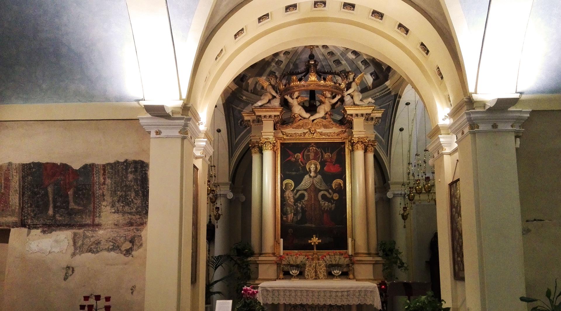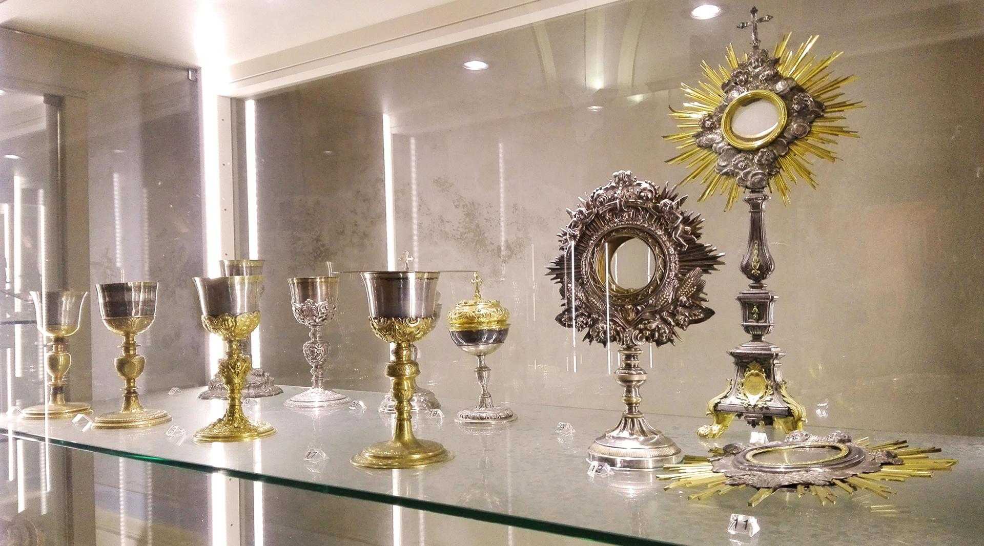 All'interno dello spazio presbiteriale dominato dalla deliziosa cantoria e inquadrato dalle due colonne neoclassiche, oltre alcuni rilievi del XVII e XVIII secolo (Angelo, Ecce Homo, Testa di Cristo e Immacolata) e la statua di San Giuseppe, posta nella nicchia sull'altare, sono una serie di espositori nei quali sono collocati pregevoli arredi ecclesiastici del XVI-XVIII secolo: croci; ostensori; calici; pissidi; servizi da mensa, da aspersione e da incenso; reliquiari; tabernacoli; carteglorie, candelabri e candelieri. Tra i calici si segnalano reperti di grande valore come quello datato 1591 ed altri due esemplari del XVI secolo. É qui collocata, nello spazio che l'ha sempre ospitata, la tela di Francesco Appiani (1704-1792) raffigurante lo Sposalizio della Vergine. Oltrepassate le tabelle confraternali si sale al piano ammezzato dove sono la saletta dei reperti archeologici, rinvenuti dopo la seconda guerra mondiale nei pressi dell'area archeologica di Fonteboccio. Nella stanza adiacente trovano posto alcuni tra i paramenti sacri più significativi del territorio, per importanza ed antichità. Una piccola apertura introduce all'interno del vecchio campanile ed ancora nella cantoria, dove si conserva un pregevole organo di Adamo Rossi datato 1795.