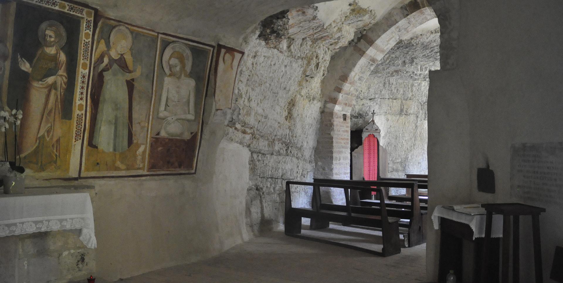 L’attuale costruzione, edificata su un primitivo oratorio dell’VIII secolo, risale al 1308. Secondo la tradizione, l’oratorio apparteneva in origine all’abbazia di Farfa, in seguito passò all’abbazia di San Pietro in Valle; i monaci vi si insediarono e dedicarono l’oratorio a san Benedetto.